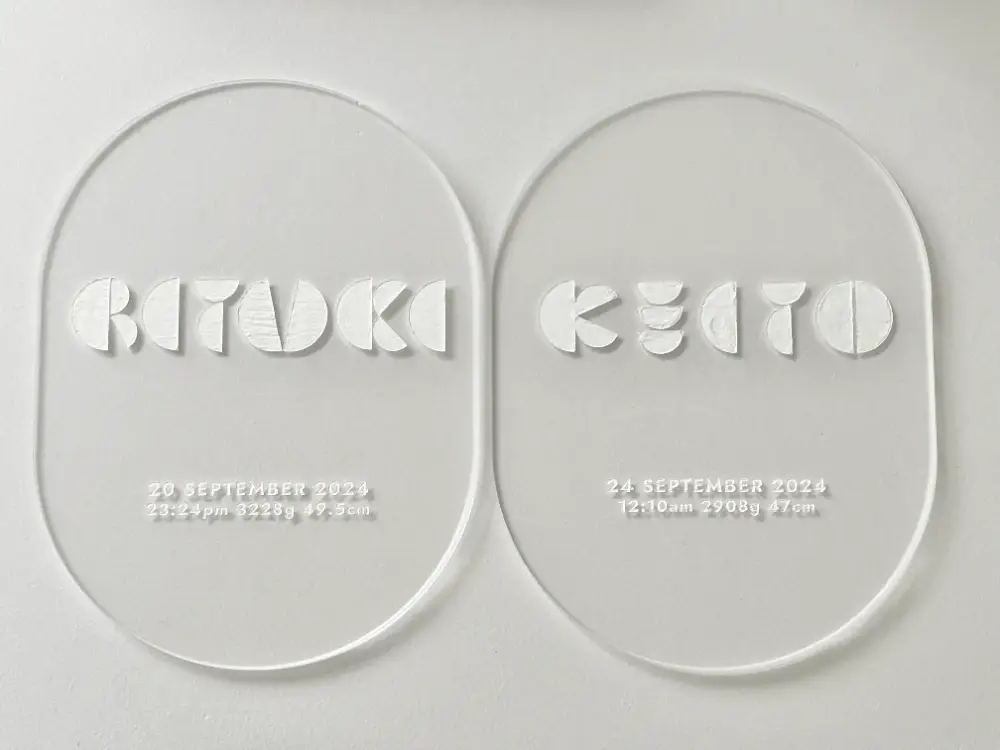 命名書はオーソドックスに筆で書くのも良いですが、おしゃれなデザインをネットでオーダーしても◎。最近では、木製プレートやアクリル素材の命名ボードも人気です。